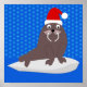 Cette affiche présente une image graphique d'un joli petit morse de Noël. Le Walrus a une fourrure brune avec de grands yeux noirs et des défenses blanches. Il est assis sur un iceberg au milieu de l'océan et porte un casquette festif rouge et blanc. Le morse est entouré de jolis flocons bleus octogonaux qui tombent tout autour.