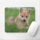 Entzückender Welpe, der das Freien erforscht und auf Löwenzahnstämmen kaut.