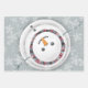 Geschenkpackung mit einem schönen Snowman in seinem gestreiften Schal, der nach oben in den fallenden Schnee blickt.
