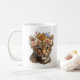 Ein hübsches Aquarelldesign mit einem niedlichen Tiger, umgeben von farbenfrohen Blume.