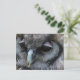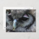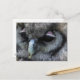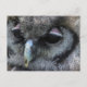 Postkarte mit einem Makro-Foto einer niedlichen grauen Eule mit rosa Augenlidern.