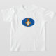 Niedliche kleine Eule mit braunem Körper und Kopf und einem hellfarbenen Bauch auf einem ovalen blauen Hintergrund. Kinder werden diesen tierischen T - Shirt mit einem Hoot tragen.