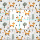 Ein glücklicher, kleiner Goldfuchs ist das Merkmal dieses niedlichen Stoffes. Zusammen mit den Fuchsbildern sind Bäume und Blume. Alles ist auf einem weißen Hintergrund angeordnet.