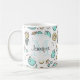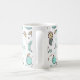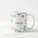 Eine Tasse mit einer niedlichen Fruchtlinie, die den Stil zeichne. Hellgrüne und gelbe Farben. Ein lustiges sommerliches Design. Ein weißer Kreis überlagert mit Ihrem Namen und einem Monogramm, das sich im Inneren befindet.