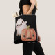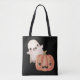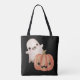 Gehen Sie Trick oder Treating im Stil mit dieser Tasche, mit einem anmutigen Geist und Jack-o-Laterne-Duo in reichen Wasserfarben dekoriert.Erhältlich in zwei Größen!