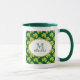 Eine Tasse mit einem niedlich wiederholenden Muster, mit olivengrünen Kleeblatten auf dunkelgrünem Hintergrund. Ein extravaganter, Vintager Rahmen, überlagert mit dem Text. Rahmen hat ein Imitat mit Goldfolie.