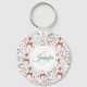 Schlüsselkette mit einem bezaubernden Weihnachtsmuster. Niedlicher Winterhirsch mit Geweih, der um einen Wald von Bäumen und Gräsern herumprangt. Ein weißer Kreis überlagert mit Ihrem Namen und einem Monogramm, das sich im Inneren befindet.