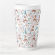 Eine verstorbene Tasse mit einem bezaubernden Weihnachtsmuster. Niedlicher Winterhirsch mit Geweih, der um einen Wald von Bäumen und Gräsern herumprangt.