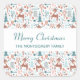 Frohe Weihnachtsaufkleber mit einem bezaubernden Weihnachtsmuster. Niedlicher Winterhirsch mit Geweih, der um einen Wald von Bäumen und Gräsern herumprangt.