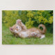 Ein lustiges und frisches Kätzchen, ein rotes Tabby und eine weiße Babykatze mit wunderschönen blauen Augen, im Spiel und mit ihren Krallen draußen in grünem Gras, macht es zum Lächeln. Ein niedliches Baby Cat Foto von Katho Menden.