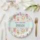 Geburtstagspapier-Teller mit einem skurrilen Muster mit einer Sammlung von reizvollen Kinderspielzeug und Tieren.