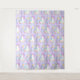 Ein Wandteppich mit einer Abbildung eines niedlichen und kawaiianischen Einhorns, das friedlich mit einem extravaganten, lockigen Mann und Schwanz schläft. Ein farbenfroher Regenbogen hinter einem Sternschuss . Hintergrund ist ein weißes und lila Polka-Punktmuster. Schönes Fantasiedesign.