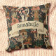 Niedliches, personalisiertes Kissen für Kinder, mit magischen Illustrationen von kleinen Hütten, die auf niedlichen Pilzen in Rot und Pfirsichfarben stehen und von Schmetterlingen, Blume und Grünpflanzen umgeben sind.