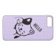 Ein Handy-Gehäuse mit anpassbarem Text, der hallo sagt und mit einer Illustration einer lächelnden und schwungvollen Kätzin mit einem schwarzen Fleck um sein Ohr entworfen wurde. Lila Polka Punkt Hintergrund. Einfach niedlich und hübsch.