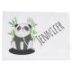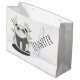 Eine große Geschenktasche mit einer Illustration eines schwarz-weißen Panda Bären sitzend in einem grünen Aquarellbambus. Eine kleine Sprechblase mit einem Herzen drinnen. Niedliches Design mit einem Panda, der seine Liebe ausdrückt. Personalisieren mit einem Namen.