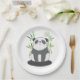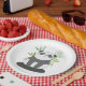Papier Teller mit einer Illustration eines schwarz-weißen Panda Bären sitzend in einem grünen Aquarellbambus. Eine kleine Sprechblase mit einem Herzen drinnen. Niedliches Design mit einem Panda, der seine Liebe ausdrückt.