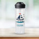 Diese personalisierte Wasserflasche verfügt über ein niedliches, blau-weißes Segelboot.