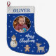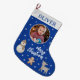 Niedlich Snowman Reindeer Gingerbread Man Snowflake Foto Grosser Weihnachtsfest Strumpf. Ein niedlicher Weihnachtsmann mit hübschem Schneemann, Rentier und Lebkuchenmann auf blauem Hintergrund mit weißen Schneeflocken. Fügen Sie Ihren Namen und Ihr Foto hinzu.