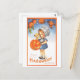 Diese Postkarte ist eine Reproduktion einer Vintagen Halloween-Postkarte, die ein niedliches Mädchen mit ihrem Welpen und einer Jack-o-Laterne zeigt.