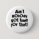Ein lustiger Slogan-Text-Design-Button mit der Phrase Ain't Niemand Got Zeit dafür. Fügen Sie zusätzlichen Text hinzu, um diesem Design eine persönliche Touch zu geben.