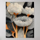 Diese cremefarben getupfte florale Dreiergruppe mit gemusterten Blättern präsentiert eine stilisierte botanische Illustration mit drei cremefarbenen Blüten mit feinen vertikalen Linientexturen und warmen orangen Zentren. Umgebende Blätter in Blau, Weiß und Orange zeigen komplizierte Punkt- und Linienmuster, alle vor einem tiefschwarzen Hintergrund, der den Kontrast und die Details des Kunstwerks verstärkt. Dieses hochauflösende digitale Download im vielseitigen 4:5-Format bringt leuchtende Kunstfertigkeit und handgefertigten Charme in jeden Raum, perfekt zum Einrahmen, Verschenken oder zur Aufwertung Ihrer Heimdekoration mit lebhafter Garteneleganz. #DigitalDownload #moderneBlumen #Musterillustration #GrafikdesignKunst