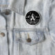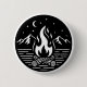 This circular campfire button features a classic pyramid stack of logs topped with a flowing flame, set beneath a crescent moon and a subtle field of stars. Designed in bold black and white, the artwork keeps the details clean and balanced so it reads beautifully even at small sizes.