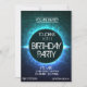 Une invitation à l'anniversaire avec un thème de discothèque. Bleu brillant néon lumières. Bon si vous avez votre fête dans un club, un bar ou une discothèque.