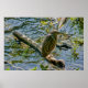 Ein Foto eines unreifen Heronvogels, der auf einem Flusslog stehend ist. Andere Äste und Stämme können schwimmend gesehen und im Wasser getaucht werden. Wasseratische Pflanze ragen aus dem Wasser hervor, und die Szene wird von Blätter umrahmt. Die Wellen im Wasser zeigen die Bewegung des Flusses. Image Copyright ©2021 Kimberly J Tilley.