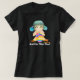 Ce tee - shirt noir présente une image colorée d'une fille qui tricot joyeusement un foulard. La légende "Just One More Row !" est affichée en-dessous, en caractères gras et ludiques. Cette phrase est un mantra populaire parmi les tricoteurs et est souvent utilisé pour s'encourager à continuer à aller et compléter juste une ligne de plus d'un projet de tricot avant de prendre une pause.