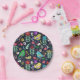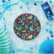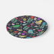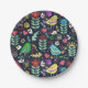 Diseño de plato de papel único con fondo azul oscuro, presenta un estilo folk con elementos como pájaros, flores y hojas con una paleta de colores vivos y alegres, que destacan sobre sobre la superficie.