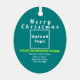 Joyeux Noël! Métal ornement avec Joyeux textes de voeux de Noël, votre nom d'entreprise ou d'entreprise, logo, adresse et numéro de téléphone. Les dessins sont des textes jaunes verts et blancs sur arrière - plan vert turquoise et sur forme ovale. Ornement pour décorer le sapin de Noël dans votre magasin, magasin ou bureau. Ornement pour accueillir visuellement vos clients cette saison de vacances et pour annoncer votre entreprise ou promouvoir votre marque. Customisez-le et utilisez-le pour sensibiliser la marque. Veuillez vérifier l'apparence après avoir téléchargé le logo et tapé des textes. Si l'apparence vous plaît, vous pouvez passer votre commande maintenant. Si vous avez besoin de redimensionner et déplacer le logo et les textes pour s'adapter à cet ornement ou à d'autres styles que vous choisirez, s'il vous plaît changer dans l'outil de conception. Vous pouvez également effectuer d'autres modifications selon vos préférences dans l'outil de conception, comme changer la couleur de l'ornement, la couleur de police et le style de police. Joyeux Noël! Je vous souhaite plus de ventes cette saison des Fêtes.