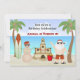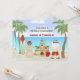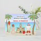 Personnalisé Cute Père Noël Beach Noël Fête d'anniversaire Invitations avec palmiers décorés, bonhomme de neige de sable, château de sable et ornements de vacances. Quelques graphiques par artwork&@delightful-doodles.com.