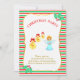 Invitation de l'ange de Noël. Petit ange habillé en bleu clair avec des boules de Noël dorées sur arrière - plan rayé blanc, vert et rouge.