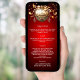 Carte menu du dîner de Noël. Personnalisez et ajoutez un nom/événement, une date et un menu. Arrière - plan rouge, texte blanc. Décoré d'un auble doré. Texte : Joyeux Noël