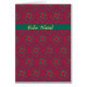Une carte de Noël design avec l'accueil (Feliz Natal) en portugais, avec un motif de baubles et d'étoiles en rouge et vert festif avec des lettres dorées. Vous pouvez également ajouter votre propre message à l'intérieur de la carte.