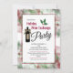 Cette invitation Holiday Wine Exchange présente un arrière - plan d'aquarelle rouge et vert foncé et est agrémentée d'un graphique d'une bouteille de vin et d'un saint de Noël.