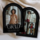 Voici notre faire-part de graduation photo en arc noir et blanc, un garde-robe moderne et élégant conçu avec une élégance minimaliste. L'avant comporte une photo en arc avec une fine bordure et le mot "grad" qui recouvre partiellement la photo. Personnalisez le modèle en ajoutant votre année de diplôme, votre nom et votre école pour créer votre faire-part avec facilité. Au dos, téléchargez 4 autres photos de vos favoris. © Kimbellished, LLC