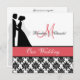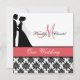 Copie noire et blanche de damassé avec une bande de corail, des jeunes mariés de silhouette, et secteurs que vous pouvez personnaliser avec vos noms, initiale de monogramme, cérémonie de mariage et information de réception sur un faire-part de mariage customisé qui est chique et traditionnelle tous dans un !