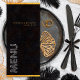 Vous recherchez un menu de dîner d'accueil mariage ? Regardez notre Black Gold Diamond Wedding Reception Dinner Menu! Ce superbe menu de mariages mariages de luxe propose une typographie audacieuse et moderne avec un effet or numérique frappant sur le cadre et le mot "menu" à l'arrière. Le mot "Menu" éblouit par un effet de diamant numérique captivant, ajoutant une touche de luxe supplémentaire. Contre un arrière - plan noir épuré, ce design respire l'élégance et le raffinement, parfait pour les couples à la recherche d'un style contemporain et chic qui se démarque. Idéal pour une célébration glamour et haut de gamme !