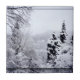 Ein Foto, das nur einen Blick auf den Bergsee durch schneebedeckte Tannenbäume zeigt. Dieses Landschaftsbild wird digital so bearbeitet, dass es wie eine Wasserfarbe aussieht. Der Nojiri-See ist ein Gletschersee in den japanischen Alpen. Es ist ein beliebter Ferienort im Sommer und im Winter, und die Winter-Olympia 1998 fanden in Nagano und den umliegenden Skipisten statt. Obwohl das Klima gemäßigt ist und der See selten überfriert, sind die Berge im Winter meist mit mehreren Füßen Schnee bedeckt.
