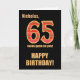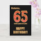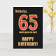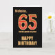 Une carte contemporaine de 65ème anniversaire à customiser pour n'importe qui mais qui peut particulièrement séduire un homme. Il y a un grand numéro 65, délimité dans l'effet or et rempli de rayures rouge, orange et vert vif, sur un arrière - plan noir. Le message d'accueil de couverture dit : "65 vous va bien ! HEUREUX ANNIVERSAIRE !" en gras à effet or et il y a de la place en haut pour vous d'ajouter le nom du destinataire. Le message intérieur peut également être personnalisé.