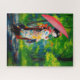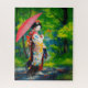 Puzzle japonais geisha. Nom du design Je marche. L'oeuvre dépeint une scène estivale sereine dans un parc, avec un dégradé de couleur verte dominant créant une atmosphère luxuriante et apaisante. Au premier plan, un geisha en tenue traditionnelle marche tranquillement, portant un kimono coloré et arborant un maquillage traditionnel. Elle tient un parapluie rose pour se protéger du soleil.