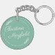 Un joli porte-clés vert jade avec un nom élégant en script associé à une délicate couronne botanique et le nom de la petite entreprise en dessous. La typographie féminine et la riche palette verte en font un accessoire de marque charmant pour les propriétaires de petites entreprises, les agents immobiliers, les décorateurs d'intérieur, les boutiques ou les entrepreneurs créatifs. Le nom, le nom de l'entreprise et les champs de texte sont entièrement personnalisables.