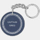 Personnalisez ce porte - clé classique de marine et blanc avec votre nom de bateau et le registre du navire, mis sur un badge de corde avec une illustration d'ancre au centre. Ajoutez le nom du capitaine, ou votre message personnalisé, à l'arrière en lettres blanches sur un arrière - plan bleu marine. Fait un grand cadeau pour les nouveaux propriétaires de bateaux, les propriétaires de bateaux domestiques ou les capitaines!