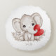 Coussin rond d'éléphant mignon personnalisé avec un éléphant mignon tenant un coeur rouge, design mignon, moderne et simple. Petit motif de pois gris à l'arrière. Beau détail à la pépinière. Personnalisez facilement le nom. - Kate Eden Art.