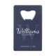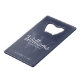 Ajoutez une touche personnelle à votre mariage grâce à l'ouvre-bouteille personnalisé des groomsmen carte de crédit. Ce ouvre-bouteille contient le nom du marionnettiste personnalisé en style de police de script classique blanc avec des détails mariages en style de police de serif classique blanc et monogramme en style de police de serif classique bleu marine clair en arrière - plan, sur arrière - plan bleu marine. Parfait aussi pour le meilleur homme, père de la mariée, porteur de bague et plus.