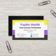 Simple business cards with the non-binary pride motive, enby pride flag in the background, and a heart with the non-binary pride colors in the front; with customizable social media icons where you can add your username for Facebook and Twitter