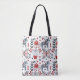 Dieser farbenfrohe Totbeutel hat ein wunderschönes und aufwändiges nordisches oder skandinavisches Muster in blau grau, rot und weiß. Die Bilder beinhalten Blumendesigns, ein dekoriertes Pony, Herzen und Strichzeichnungen. Einzigartig und sehr hübsch!
