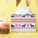 The repeated pattern on this colorful Christmas Nordic sweater style gift wrapping paper is a silhouette American Cocker Spaniel dog among snowflakes , trees, and geometric designs. Colors include navy blue, bright Holiday green, and red, all on a white background.