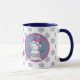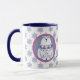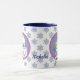 Hier ist eine niedliche personalisierte Weihnachtszeit-Tasse, die sowohl Kindern als auch Erwachsenen gefallen kann. Auf einer Seite befindet sich ein bezauberndes Schneemobild im nordischen Stil inmitten eines blau-grauen Hintergrunds, das gerahmt ist, Lavendelrosa zu verbinden. Die andere Seite hat einen Eisbären auf dem gleichen Kreisbanner. Die gerahmten Bilder werden dann auf einem passenden blauen und weißen Schneeflockenhintergrund platziert, wobei Ihr eigener Text in Marineblau zwischen den Bildern liegt.